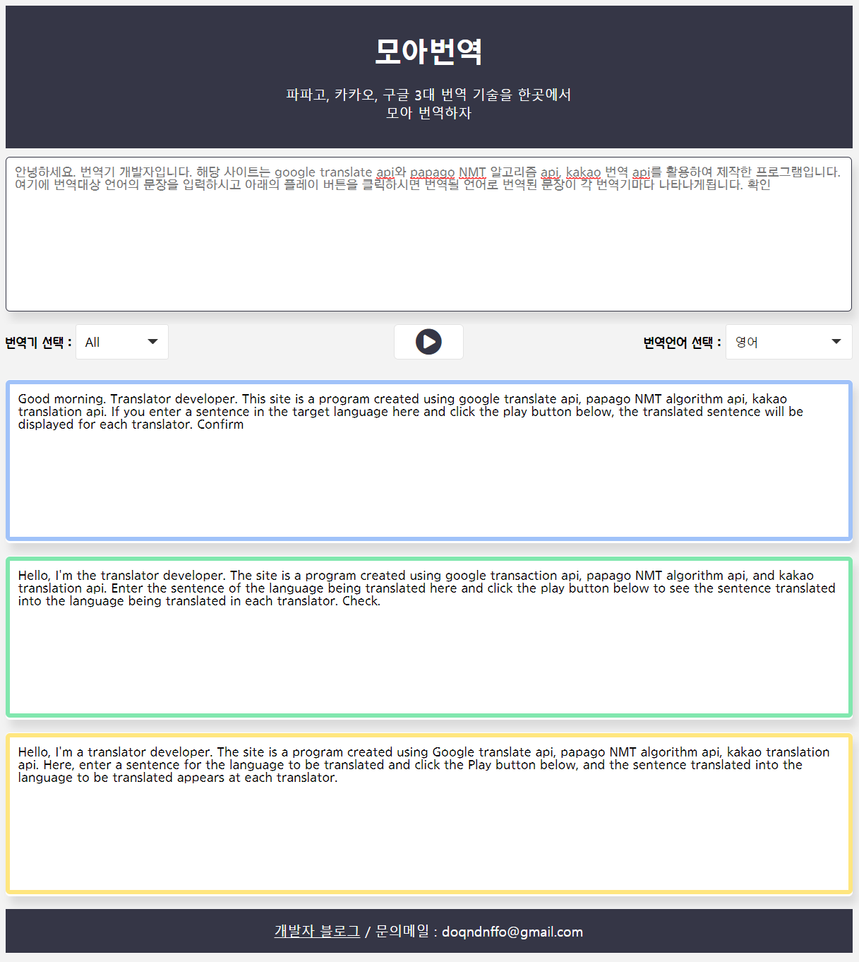제가 이런 페이지를 개발하게 된 이유는 웹서버를 두어 사이트를 운영해보고 싶었던 마음과 친구의 요청으로 진행된 프로젝트였습니다. 친구는 번역기로 영작, 번역과정을 자주하게 되었는데요. 주로 구글 번역기를 사용하였지만 꼼꼼한 성격을 가진 친구라 파파고, 카카오 번역 등 다른 번역기에서도 확인을 하고 싶어했어요. 그런데 그렇게 하기위해서는 크롬탭으로 3가지의 번역기 사이트를 모두 켜놓고 왔다갔다 해야하는 불편함이 있었다고 합니다. 여튼, 어느 하나만 믿고 하는 것보다는 여러가지 선택지를 비교하면서 작업할 수 있으면 좋겠다는 요구사항이 들어왔던 것입니다.