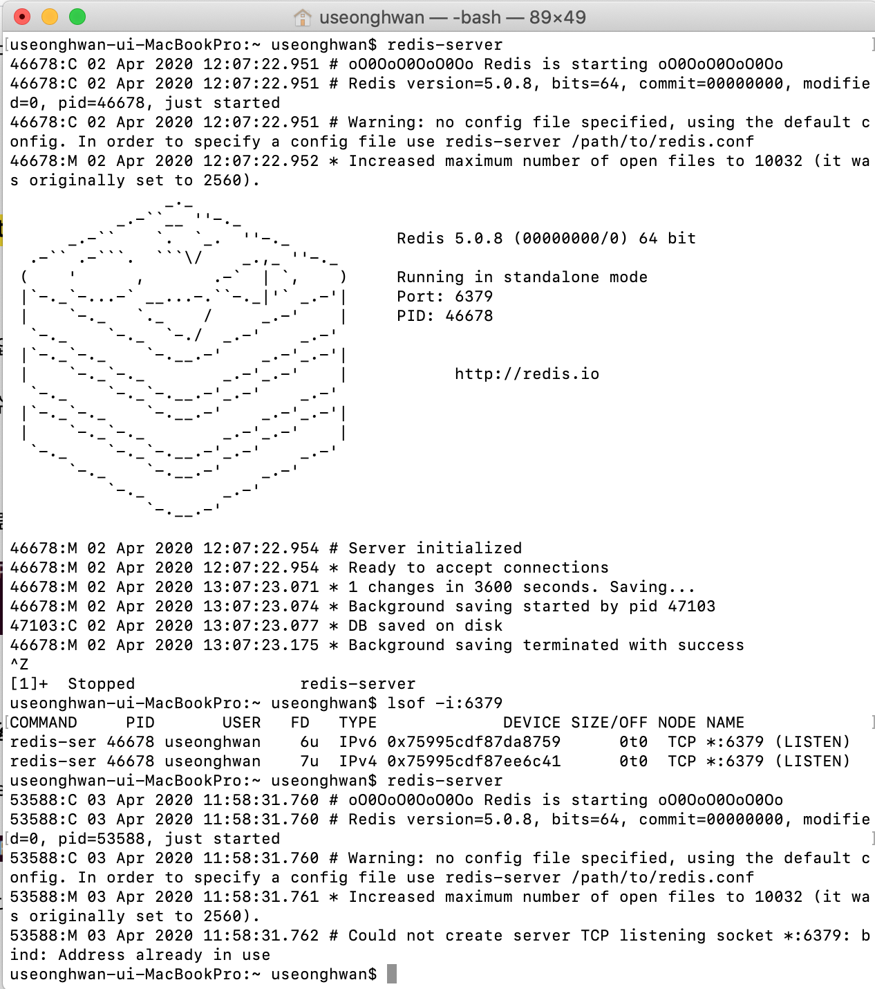 - 레디스 서버는 6379 번 포트를 잡고있고, control + z로 정지를 시켜버리니 프로세스는 살아있고, 다시 실행해보려하니 포트가 이미 사용중이라는 문구가 뜨네요.