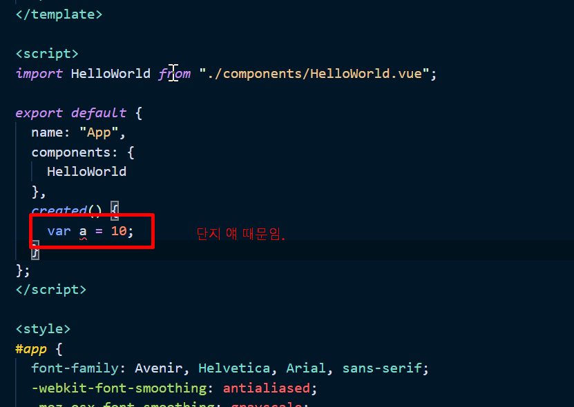 현재 이 프로젝트는 vue create을 막 마친 상태이고 created() 만 추가하여 저렇게 에러를 내도록 한 상황이다.