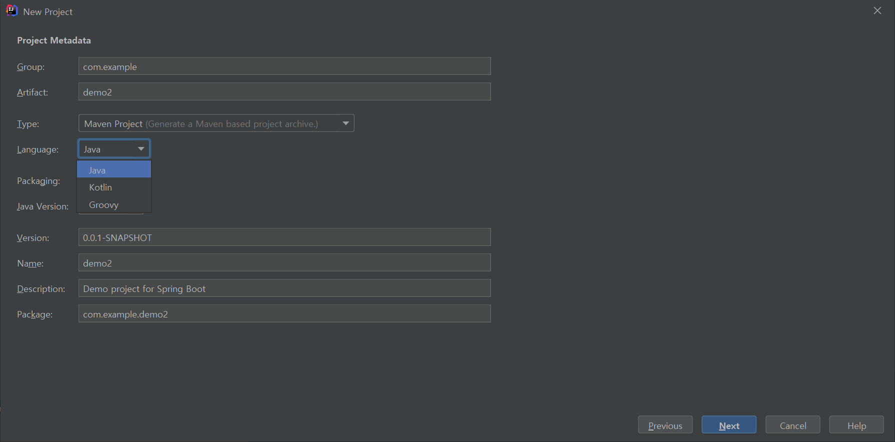 - 그 다음 Language 선택시, 기본 선택되어 있는 java말고 Kotlin으로 선택합니다.