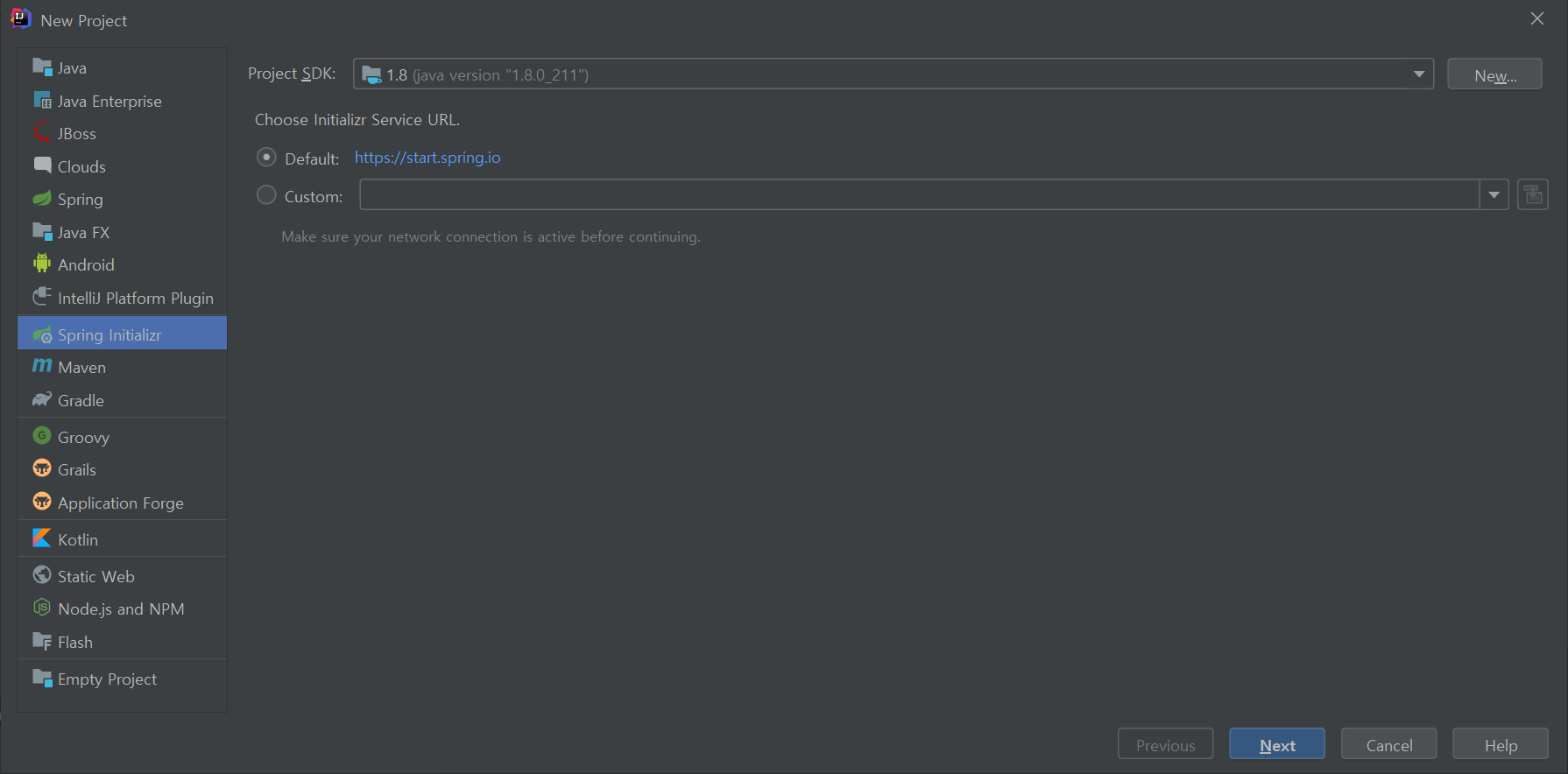 - Spring Boot Initializr를 선택한 후 Next를 눌러줍니다.