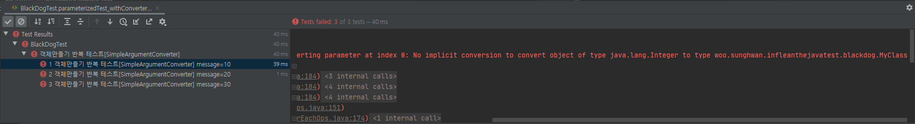 에러가 났습니다. 잘보면 Integer를 MyClass 타입으로 convert 할 수 없다고 나옵니다. 이를 위해 SimpleArgumentConverter 클래스를 상속받은 Convertor를 생성해주어야합니다.