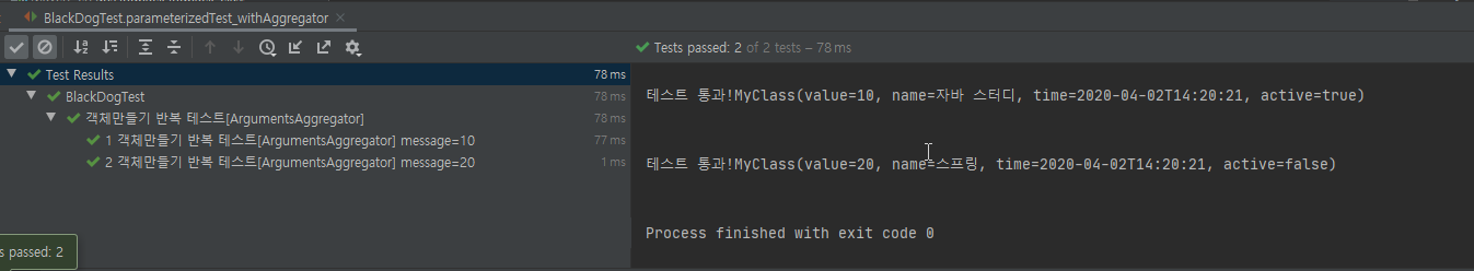 - @CsvSource({"10, '자바 스터디', '2020-04-02 14:20:21', true", "20, 스프링, '2020-04-02 14:20:21', false"})