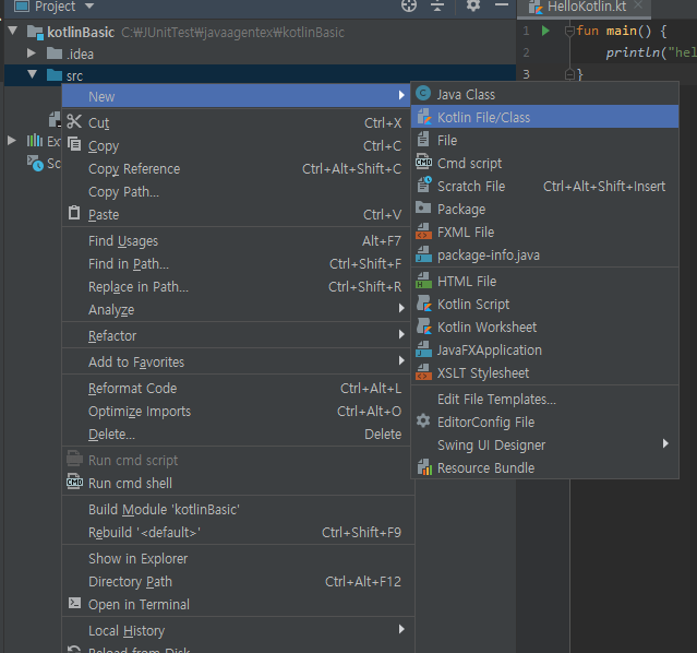 5. Kotlin 파일 생성 및 Hello World! 출력