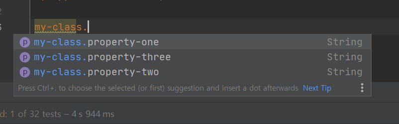 이제는 다음과 같이 각각의 속성이 자동완성됩니다. 이는 바로 @ConfigurationProperties 어노테이션을 통해 클래스파일에 존재하는 멤버변수의 변수명들을 application.properties에서 외부적으로 관리할 수있도록 도와줍니다.