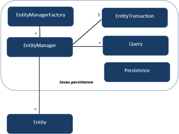 위의 아키텍처에서 클래스와 인터페이스들의 관계는 javax.persistece 패키지에 속해 있습니다. 아래의 다이어그램은 그들의 관계를 나타내줍니다.