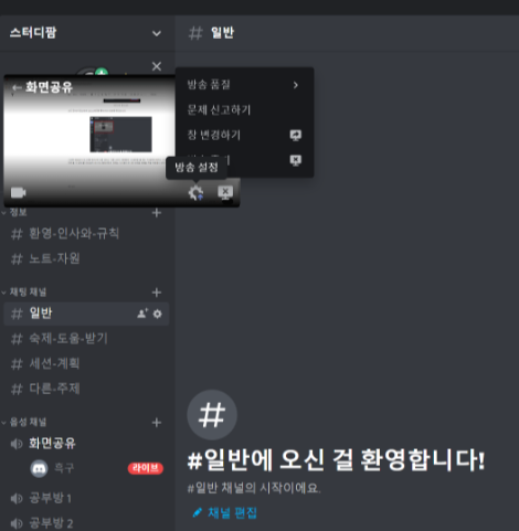 이런식으로 방송설정 버튼을 클릭하여 품질이나 내가 보여줄 창을 변경하는 작업까지 나름 깔끔하게 스터디를 언택트로 진행해도 될만큼 괜찮은 프로그램인것 같아요.!