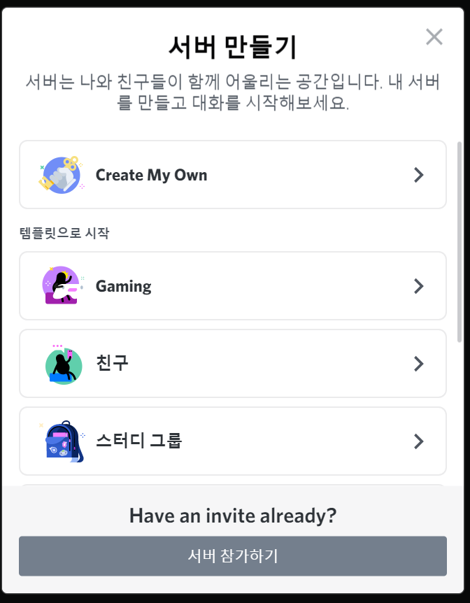 오늘은 디스코드에서 서버를 만들어서 스터디원들이 함께할 공간을 생성하고 같이 화면공유를 해보는 시간을 가져보고자 합니다.