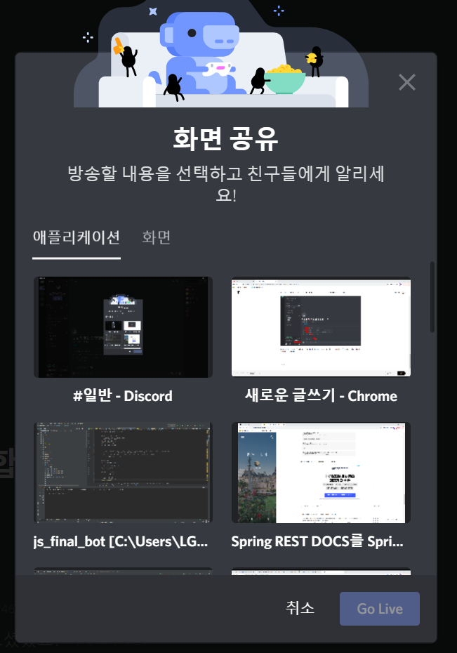 다음과 같이 하나의 음성채널을 여러 멤버들이 들어와서 음성으로 이야기를 나누면서 화면공유 할 일이 있을때, 아래의 화면 버튼을 클릭하여 어떤 화면을 공유할 지 선택합니다.