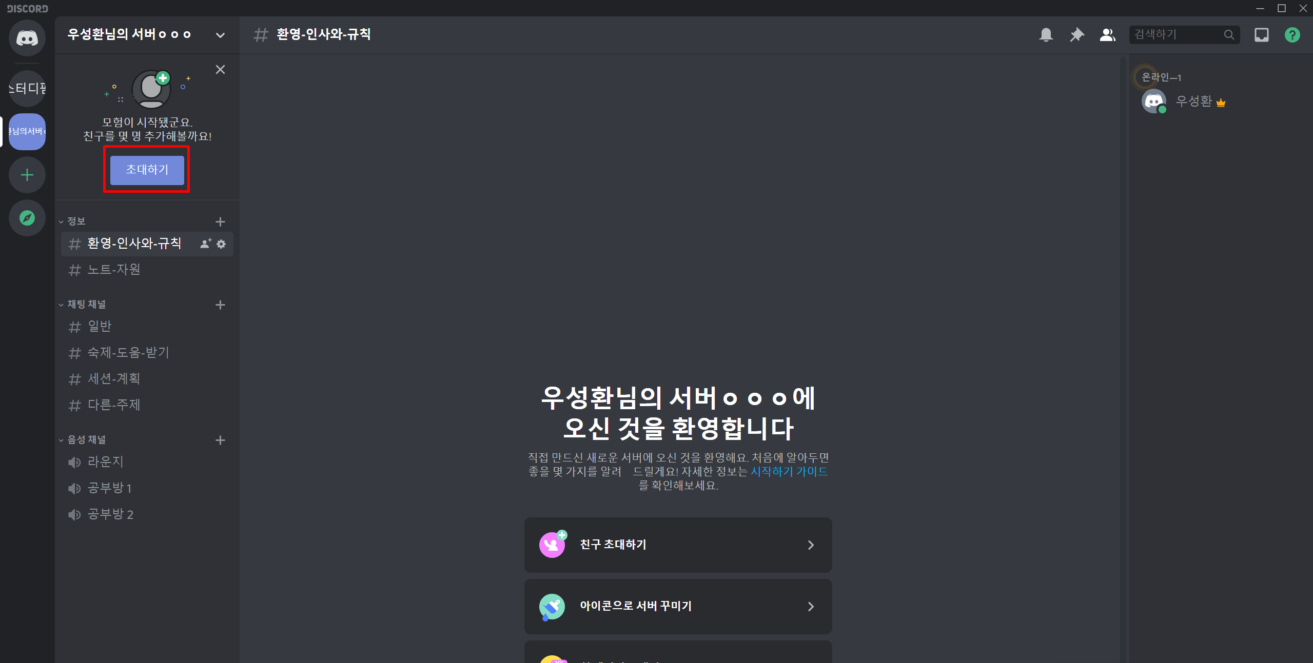 선택하셨으면 이제 서버이름을 입력하고 다음과 같이 공간이 만들어진 것을 볼 수 있습니다. 이때 초대하기를 이용하여 스터디원들을 초대해줍니다.