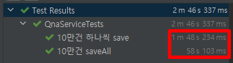 - 10만건을 saveAll로 저장하는 것과 loop를 돌면서 단건씩 저장하는 것의 결과 saveAll 의 결과가 대략 2배정도 성능이 좋은 것을 확인했습니다. 해당 테스트 이전 1만, 5만 건을 차례로 진행해보았던 것과 확연히 차이가 나는것 같아요!