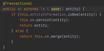 실제로 save는 10만번 호출되고 saveAll은 1번만 호출됩니다. 이러한 호출횟수와 크게 무관한 것은 아니지만 이렇게 단순한 이유는 아닐것 같아서 현재 Spring data JPA의 의존성을 뜯어보았는데요. save 메소드는 아래와 같이 구현되어 있었습니다.