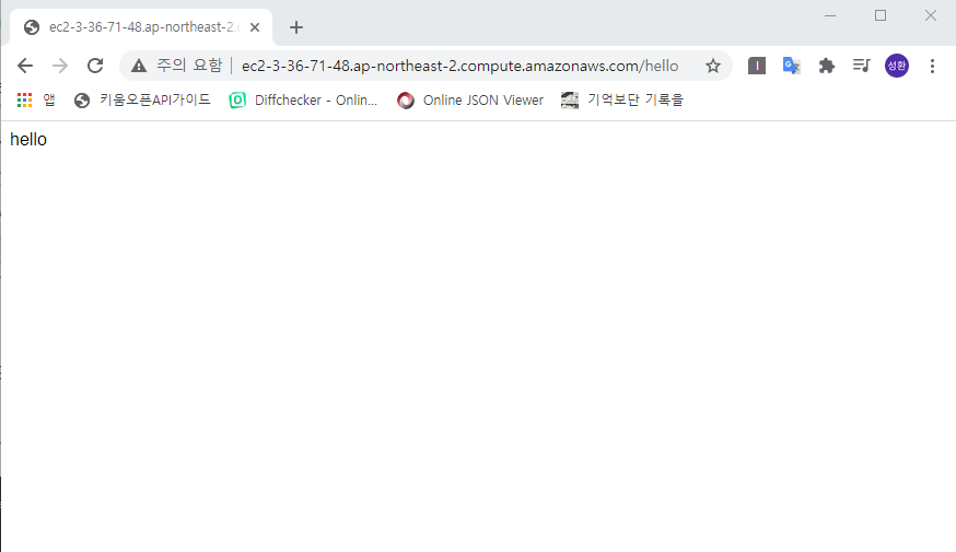 이제 서버 퍼블릭 IP주소로 /hello를 접속하면 다음과 같이 hello 라는 문자열이 잘 떨어집니다.