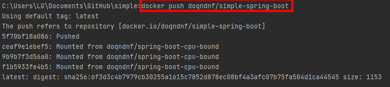 방금 올린 이미지가 잘 push 된 것을 확인하였습니다. 이제 이 이미지를 AWS EC2 서버에서 pull 받아서 docker run 명령어로 이미지를 실행하면 컨테이너가 올라가고 내부에 스프링부트 어플리케이션과 포트연동만 시켜주면 보통 스프링부트 어플리케이션이 실행되듯이 서버를 구축할 수 있습니다.