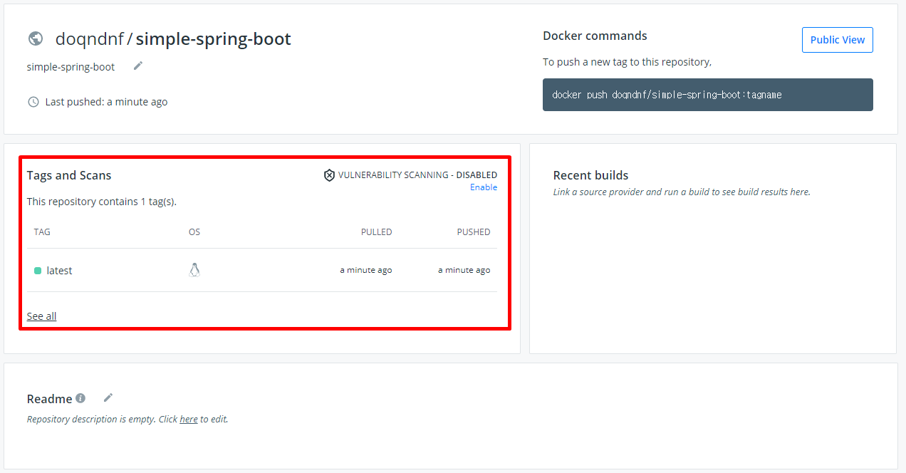 push 명령어는 docker hub 레포지토리에서도 확인이 가능합니다.