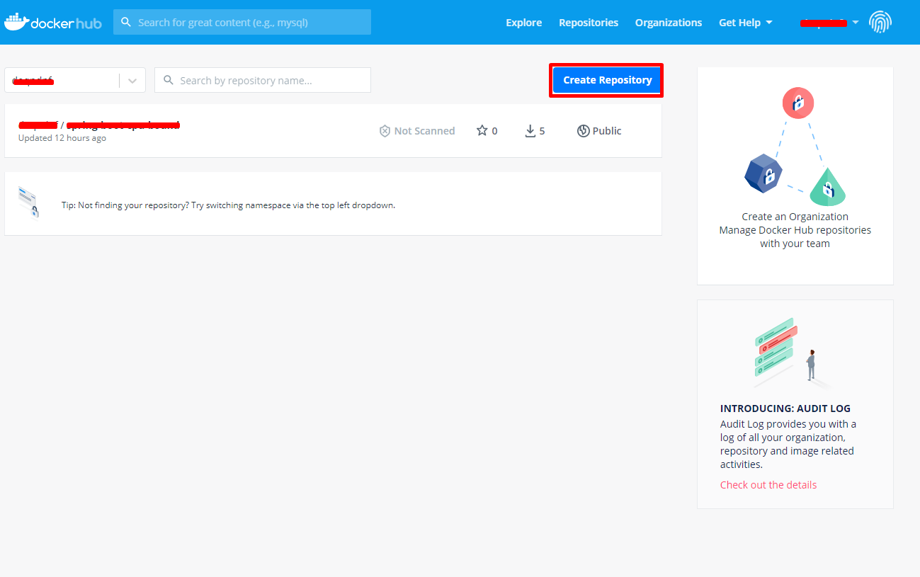 가입을 했다면 로그인을 해주시고 Create Repository를 클릭하여 Repository를 하나 생성해줍니다.