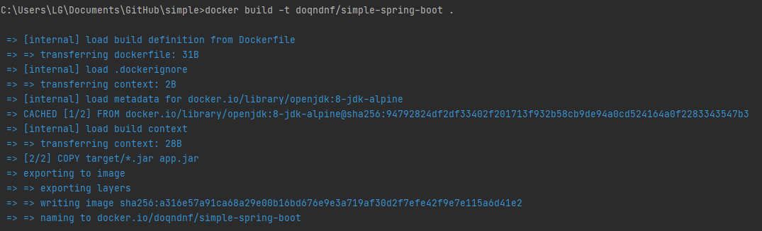 docker build --build-arg DEPENDENCY=build/dependency -t 도커허브아이디/도커허브 Repository 명 . (끝에 .까지가 명령어입니다.)