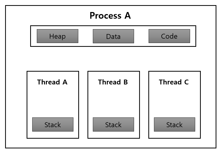 스레드는 프로세스를 구성하는 여러가지 작은 작업단위 실행흐름 중 하나입니다. CPU내에서 관리되는 여러 프로세스가 각각 고유의 자원영역을 가지는 반면, 프로세스 내의 스레드들은 stack 영역을 제외한 세개의 영역(heap, data, code)은 공유하게 됩니다.