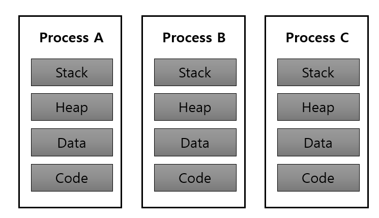 프로세스는 각각의 고유한 Stack, Heap, Data, Code 이라는 영역을 가지게 됩니다.