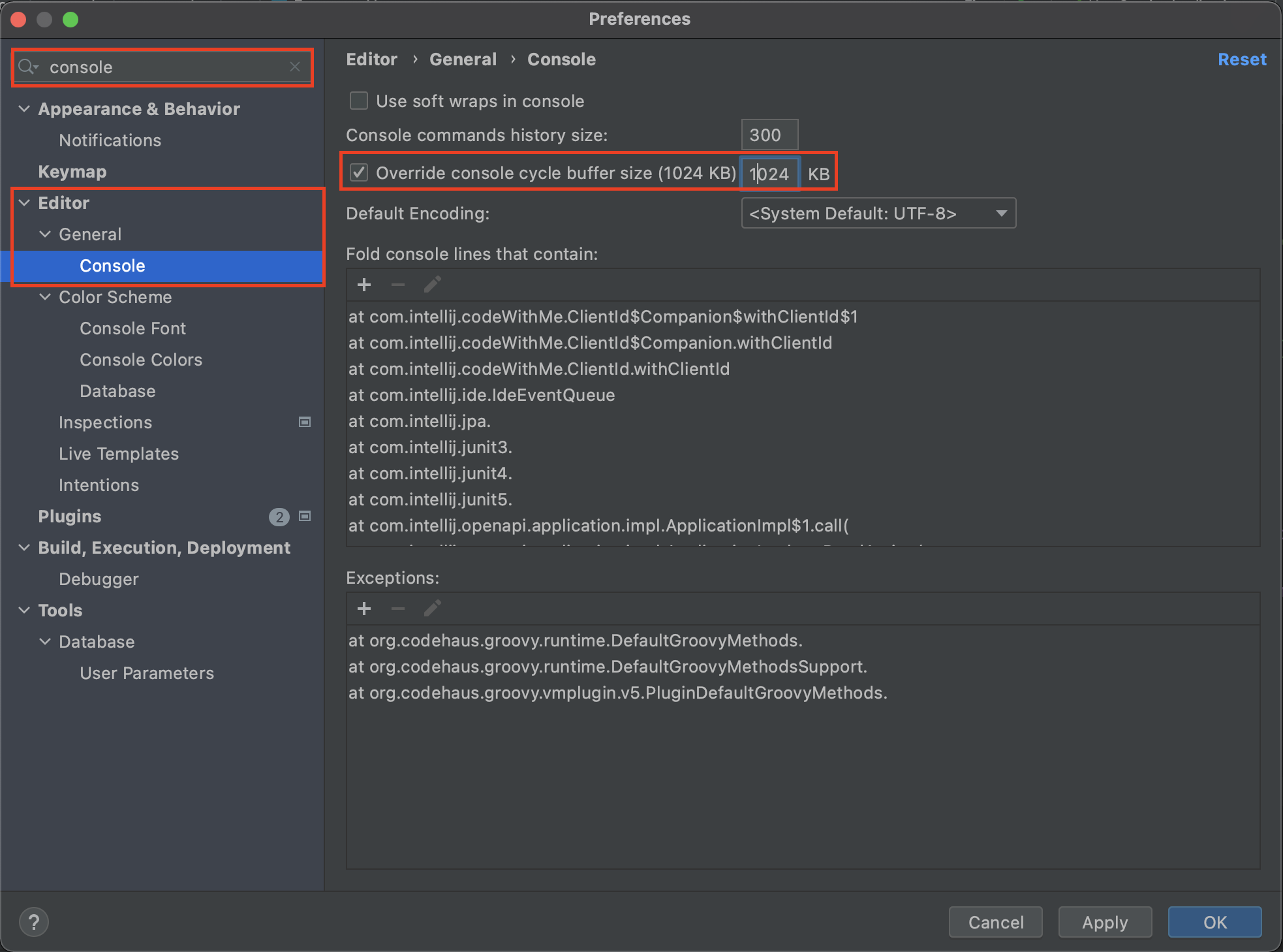 2. console 검색 -> Editor/General/Console -> Override console cycle buffer size 체크 -> 값 입력.
