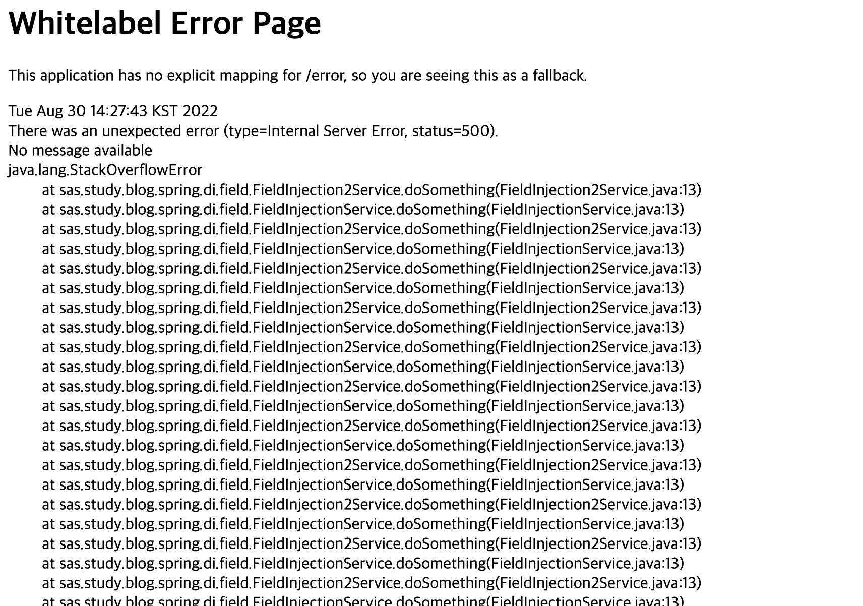 필드주입은 이러한 순환참조를 방어할 수는 없습니다.