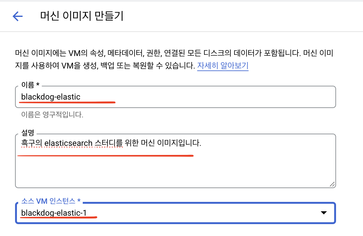 소스 머신 이미지는 위에서 생성한 blackdog-elastic으로 잡혀있는 것이 확인되고 이름도 blackdog-elastic-2로 맞춰줍니다.(사실 이건구글에서 맞춰준건데 신기한데요??)