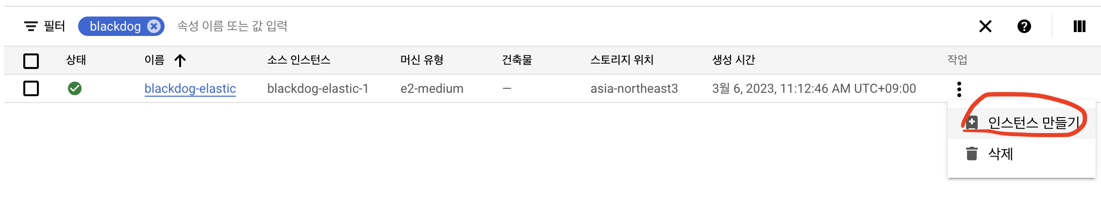생성이 완료되면 해당 이미지의 메뉴를 클릭하여 인스턴스 만들기를 클릭합니다.