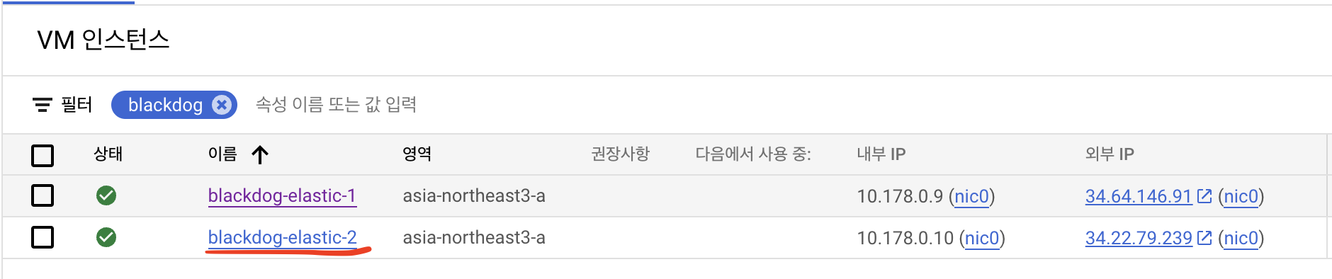 blackdog-elastic-2가 생성된 것을 확인할 수 있고 이제 각각의 머신에 ssh로 접근하여 비교해보겠습니다.