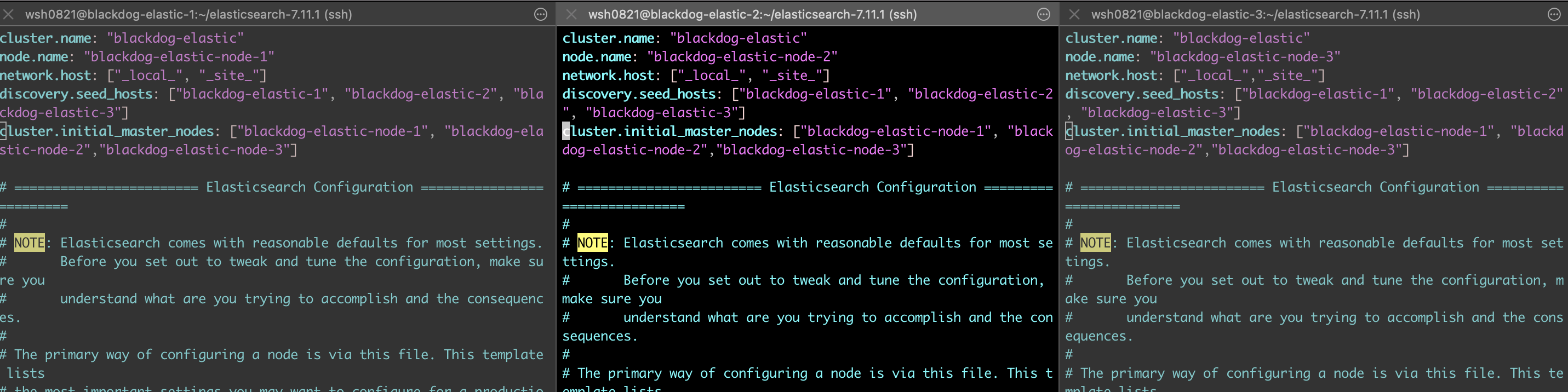 우선 세 노드 서버의 config 디렉토리 아래에 있는 elasticsearch.yml 파일이 1번 노드와 동일하게 적혀져 있을 겁니다. 이 부분을 각각 노드서버에 맞게 수정해줍니다.
