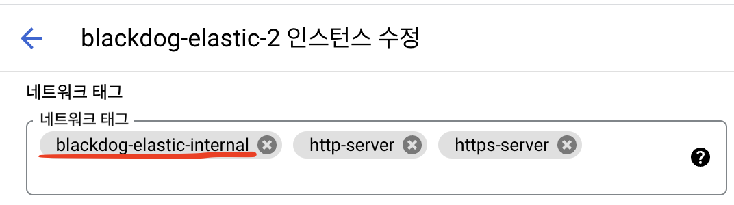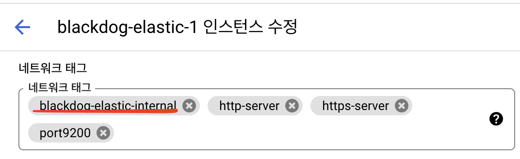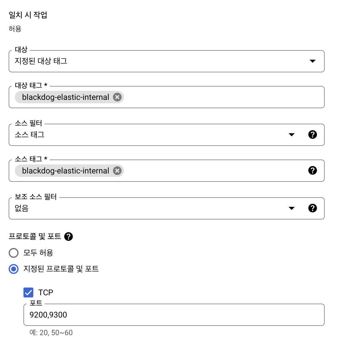 이제 여기가 제일 중요한데요. 저는 대상을 지정된 대상 태그(태그가 붙어있는 곳에 방화벽을 적용하겠다는 것.)를 이용하여 방화벽규칙과 동일한 태그를 추가한 서버만이 9200, 9300 번 포트를 오픈하도록 합니다.