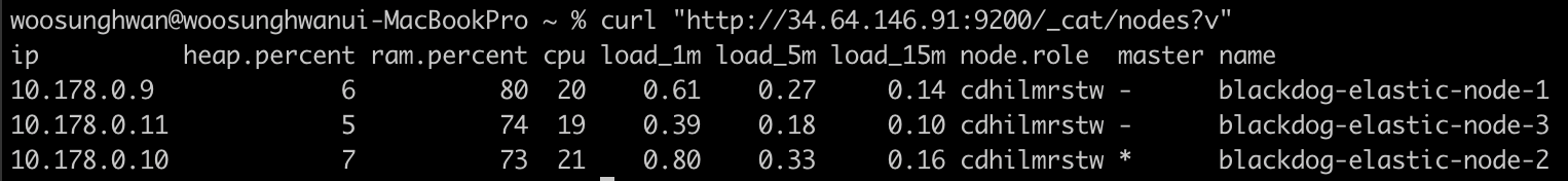 curl "http://{1번노드IP}:9200/_cat/nodes?v"