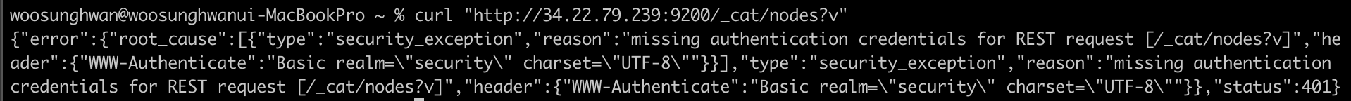 저의 엘라스틱서치 1번노드는 무사히 실행되었고 제 맥북 터미널에서 http요청 하나를 9200번 포트로 요청해보겠습니다.