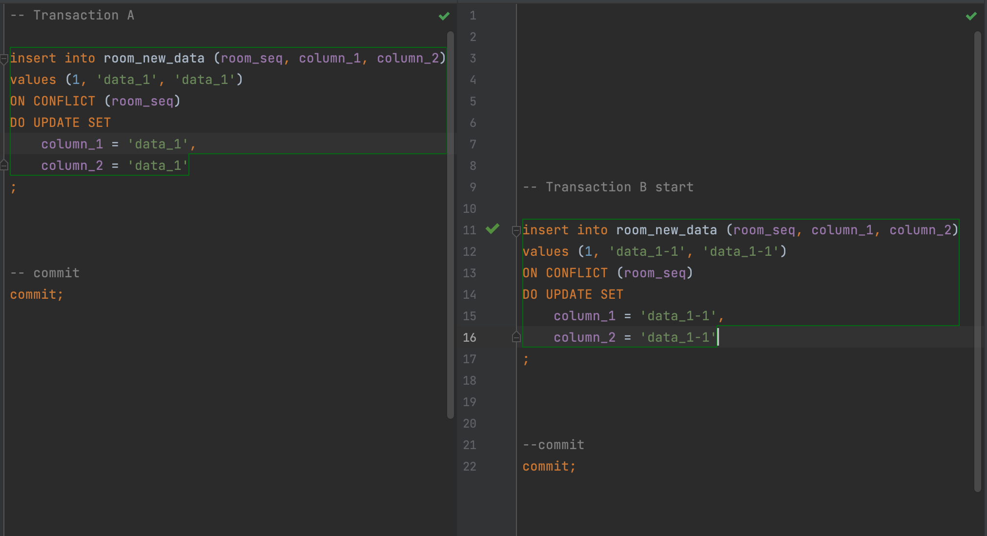 동일한 시간에 두개의 세션에서 다음과 같은 insert SQL을 동시에 날렸다면.. 먼저 커밋된 Transaction A가 정상적으로 커밋되고 Transaction B에서는 Error가 발생하였습니다. 재시도를 해도 동일한 에러메시지가 노출되어 insert 구문을 완성할 수 없습니다.